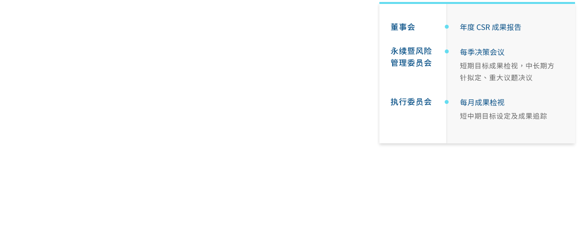 pg.ccm壹号官方版成立永续委员会(2023年更名可持续暨风险管理委员会),作为公司永续发展运作的最高治理机构,并持续策化推动企业永续转型,透过永续长及永续专责单位,统筹中长期永续发展的策略方向。
