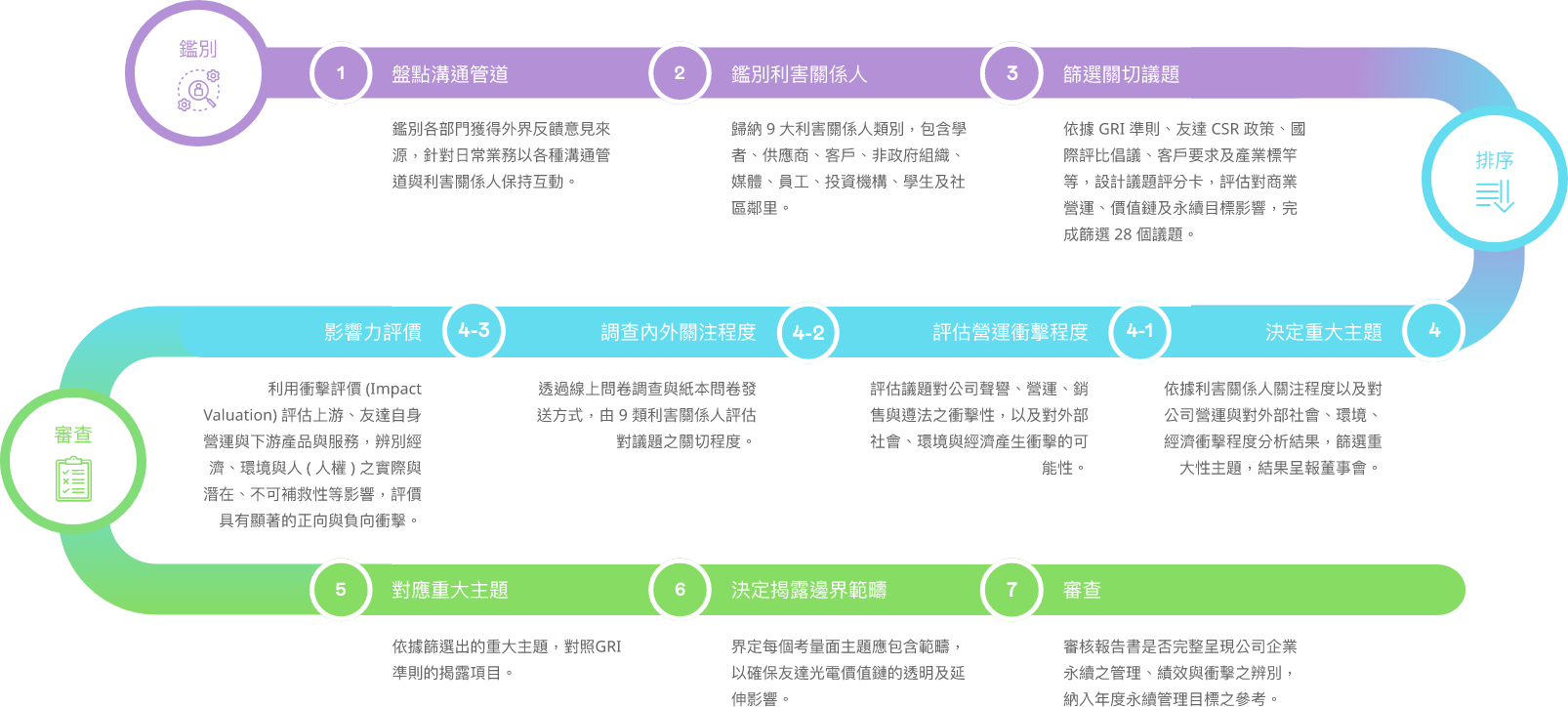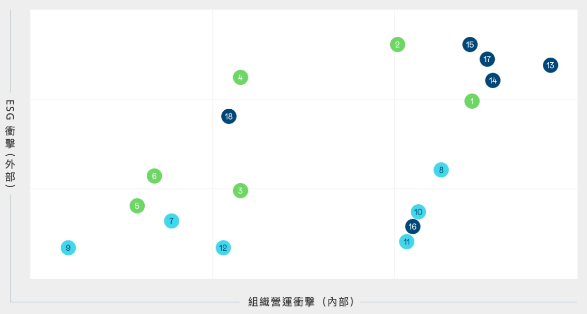 依循全球永續趨勢與 GRI 準則檢視議題之合適性,透過問卷瞭解利害關係人對公司在環境、社會 ( 含人權 )、公司治理三方面的關注面向,同時 建立雙重重大性評估方法,透過pg.ccm壹号官方版主管與價值鏈的關鍵夥伴評估 ESG 議題對公司所產生的營運衝擊程度,並在 ESG 外部永續發展衝擊方面,根據 GRI 通用準則 2021(GRI Universal Standards 2021) 的 GRI 3: 重大主題 (Material Topics 2021),整合價值平衡聯盟 (Value Balancing Alliance, VBA)、哈佛商學院「影響力加權會計 (Impact-Weighted Accounts)」研究計畫等機構發展之經濟、環境及社會層面衝擊評估方法學,建構以衝擊為基礎的重大性分析流程,辨識重大性主題。