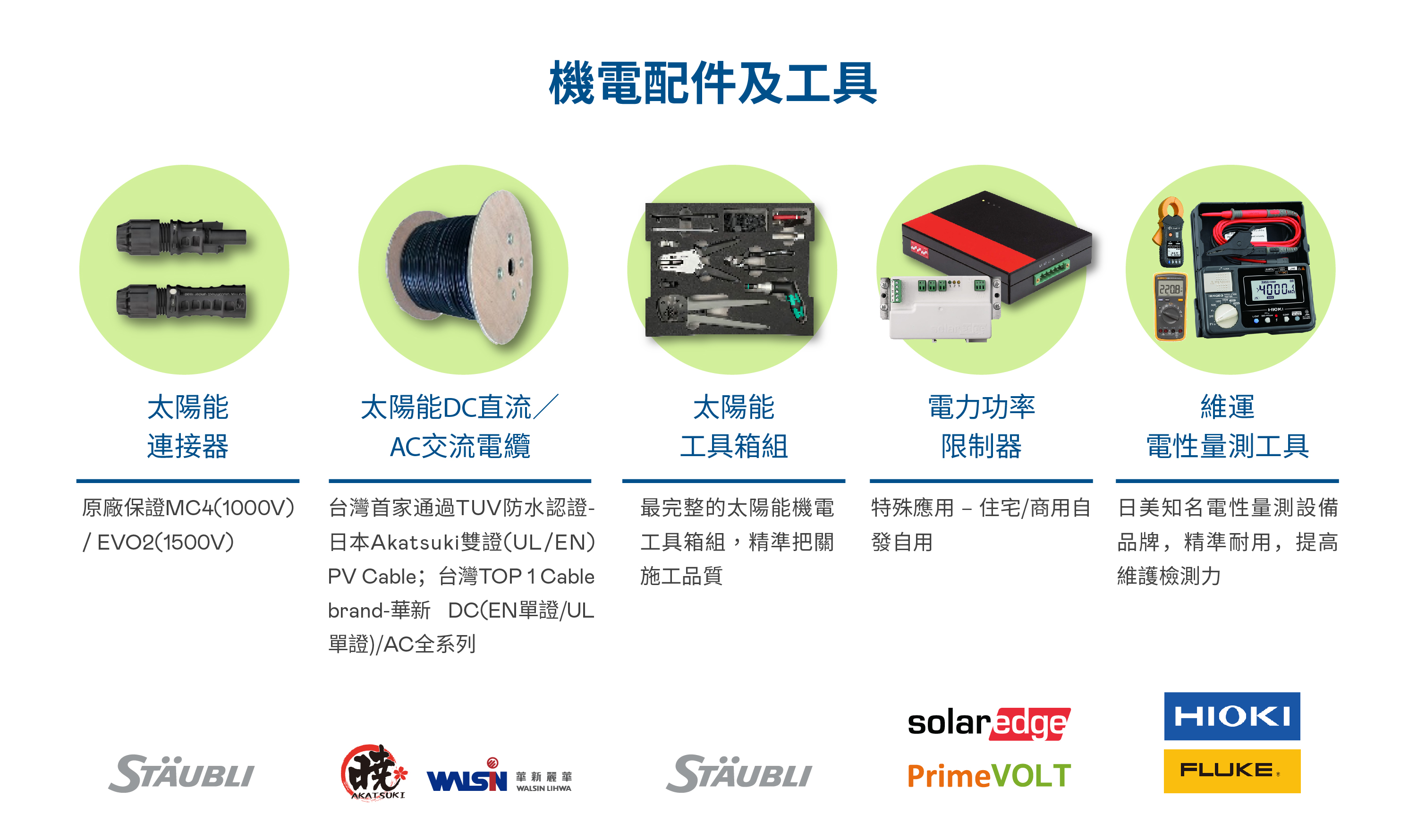 在「一站式購足」服務範疇下,pg.ccm壹号官方版除自有太陽能模組及監控監控軟硬體整合方案外, 同時提供客戶太陽能電廠其它的可靠優質零組件品牌與產品,包含電廠的重要組件如變流器、連接器、電線電纜、環境偵測裝置及相關輔佐材料與工具。