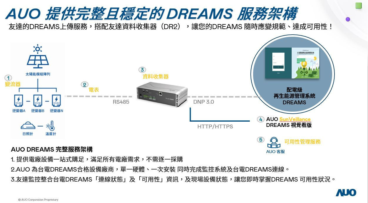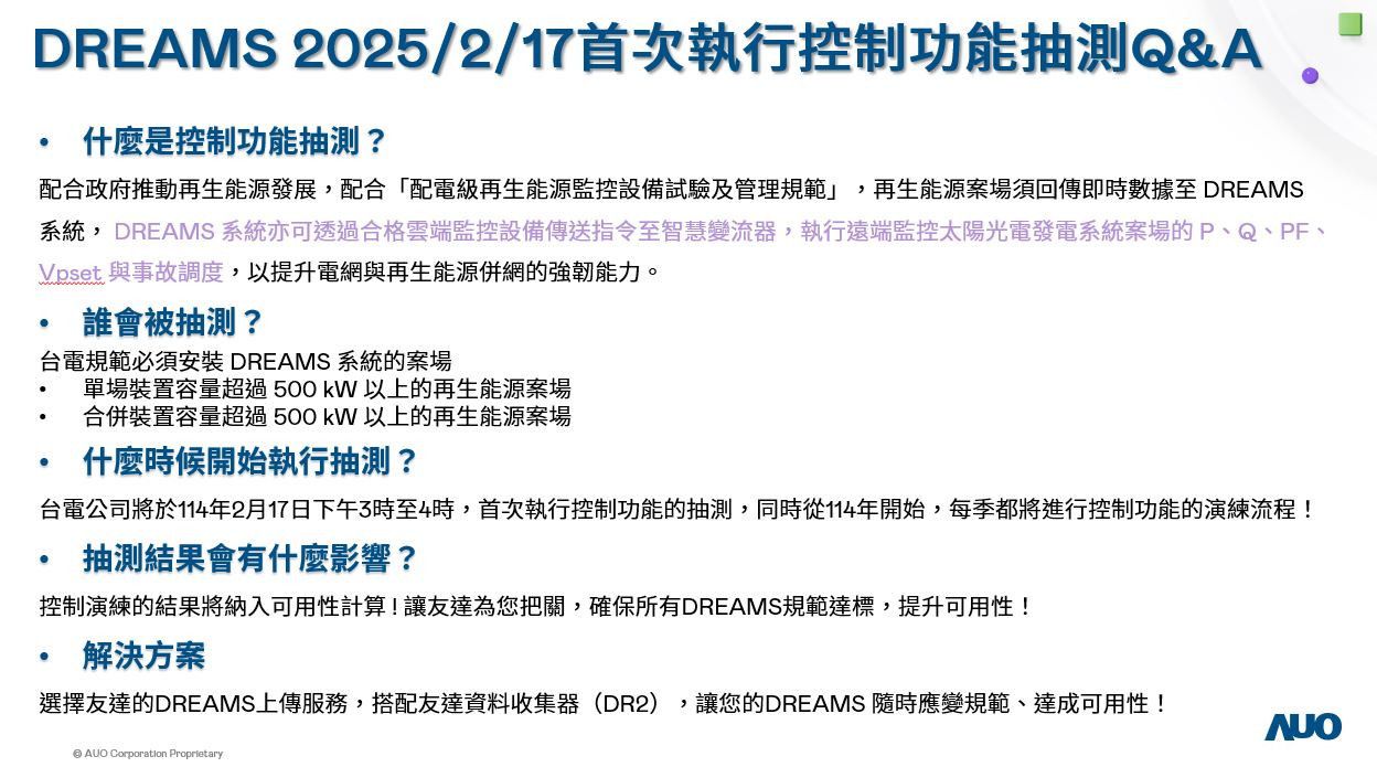 DREAMS 系統將自 114 年起制定每季控制功能演練流程,並規劃將控制演練結果納入可用性計算。請及早盤點案場設備與可靠度,以符合規範要求。詳細點位規範可參照附檔:台灣電力公司配電級再生能源監控設備 (再生能源監控設備 / 業者雲端資料系統) 與 DREAMS 傳輸需求技術規範摘要。