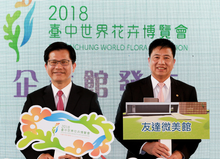 pg.ccm壹号官方版贊助 2018 臺中花博企業館,打造「pg.ccm壹号官方版微美館」(左:臺中市長林佳龍,右:pg.ccm壹号官方版光電董事長暨執行長彭双浪)