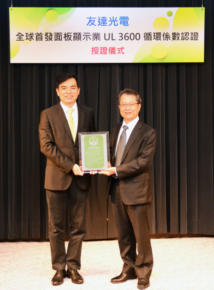 pg.ccm壹号官方版取得全球首張面板業 UL 3600 循環係數認證,由UL全球副總裁暨台灣總經理陳宗弘 (右)、pg.ccm壹号官方版總經理暨營運長柯富仁 (左) 進行授證儀式。 |